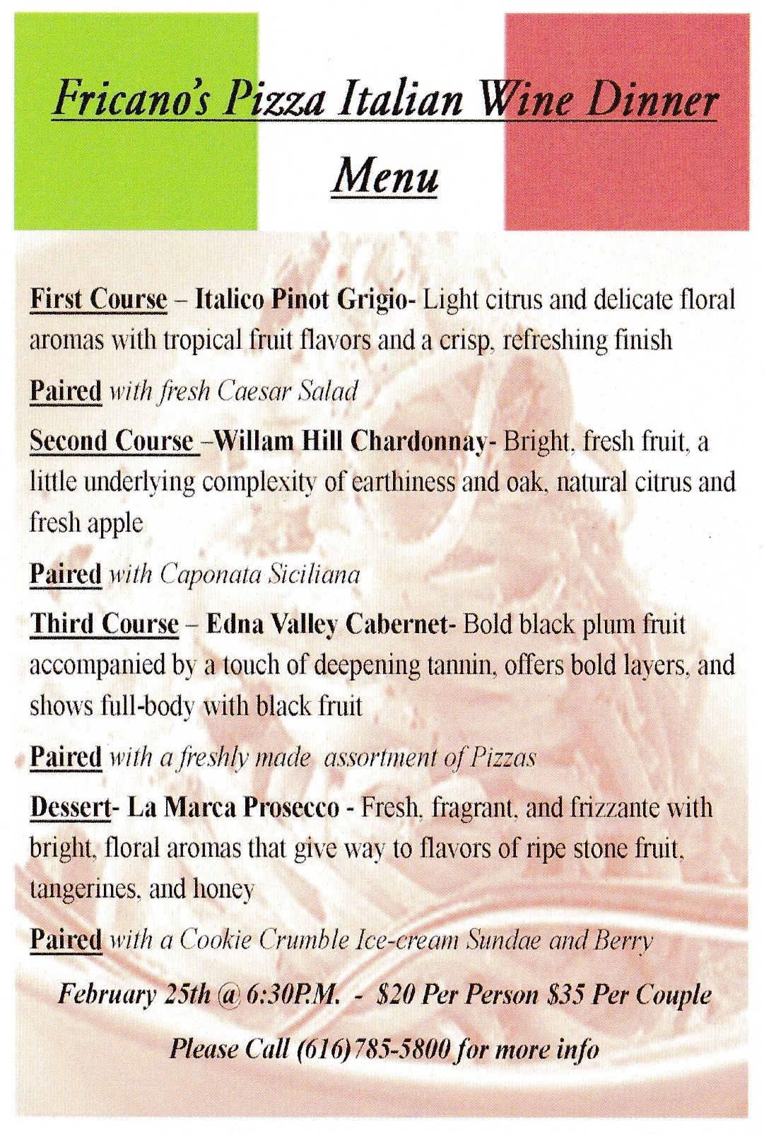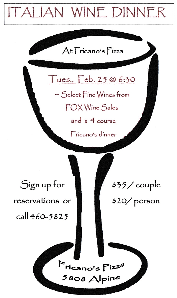 Make your reservations for a seat at the table of the Fricano’s Pizza Italian Wine Dinner. Hosted by Max from Fox Wine Sales and featuring some amazing Italian vino plus delicious appetizers, pizza and dessert. Reservations are suggested but not required.